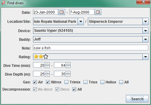 Search and filter functionality:- search by dive computer- search by location, site, notes and buddy- search by range of dates, dive times and depths- search by gas mix and decompression events- search by dive rating