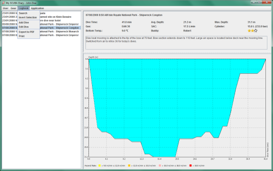 Divelogs include:- date, time, location and site- length of the dive- average and maximum depth- bottom temperature- used cylinder and gas mix- SAC rate- divers notes- buddys name- rating- dive profile with marked ascend speed violations and other events