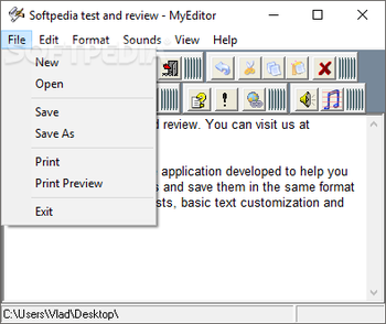 MyEditor is an easy-to-use application developed to help you create and modify RTF files and save them in the same format or MYE. It features bullet lists, basic text customization and sounds.