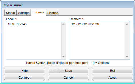 While this may seem like a system resource grinder, MyEnTunnel performs at its best without that much fuss and even provides a “Slow Polling†option to further limit its resource utilization. Interface-wise, the application keeps everything simple and well-organized. The main and only window is divided into four tab sections varying from Status and Settings to Tunnels and License.