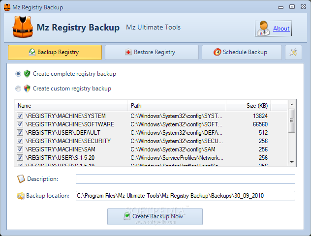 The interface of the application is clean and pretty intuitive. So, you can create a complete or custom registry backup, after specifying the description and location. Restoring a backup can also be done with the help of this app.