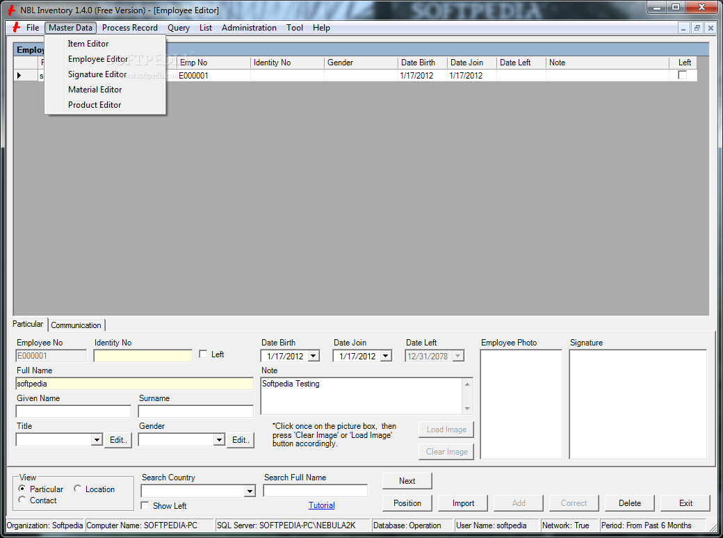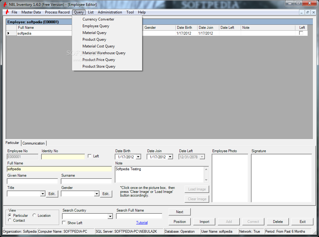 NBL Inventory is a Windows database-driven software designed for Soho, small and medium size company, to manage and monitor raw material warehouse or finished product stock quantity and movement Include feature: Master Editor: store employee, organization particular or contact, and material or product information Listing: Query, print or export master data and inventory data to file for viewing Security: Control user to access the data with user management.
