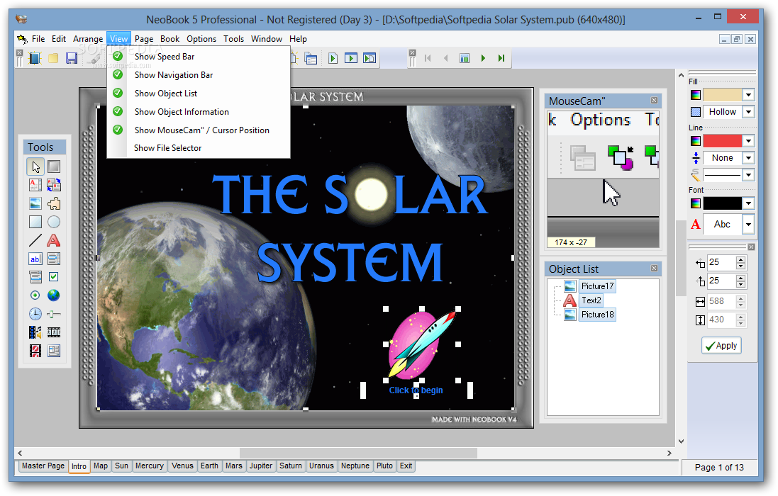 Access your favorite word processor, sound editor, animation editor and/or paint program directly from NeoBook to edit text, images, audio and animation clips.