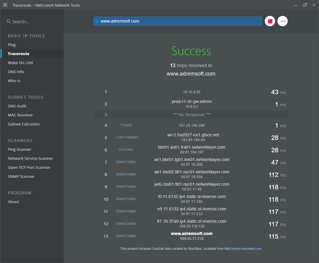 NetCrunch Tools is a completely free toolkit for network professionals, featuring Ping, Traceroute, Wake OnLAN, DNS Info, Who Is, Ping Scanner, Network Service Scanner, Open TCP Port Scanner, SNMP Scanner, DNS Audit, Subnet Calculator and Mac Resolver in one.It can work standalone, or in conjunction with the NetCrunch network monitoring system, an all-in-one, agentless network monitoring and management suite.It is completely free to use, with no usage limitations of any kind. Future updates can be installed from the NetCrunch Tools homepage, or through the software itself.