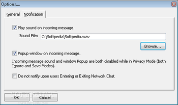 The “Options†screen is, again, limited, allowing you to configure a few general settings, as well as notifications for every newly received message. You can play a sound on an incoming message or bring the window to front every time you receive a new message.