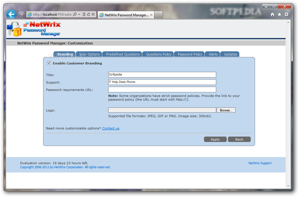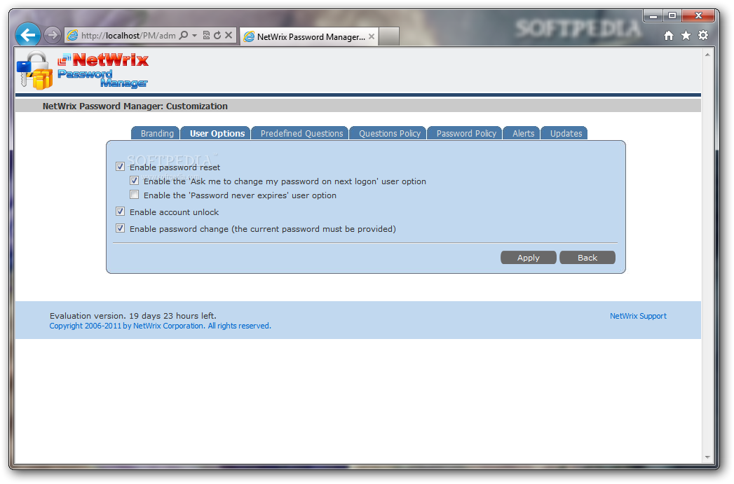 NetWrix Password Manager is a simple and cost effective solution which enables the users to reset forgotten passwords, troubleshoot account lockouts and unlock their locked accounts manually, through convenient web-based self-service portal and integration with standard Windows logon procedure.