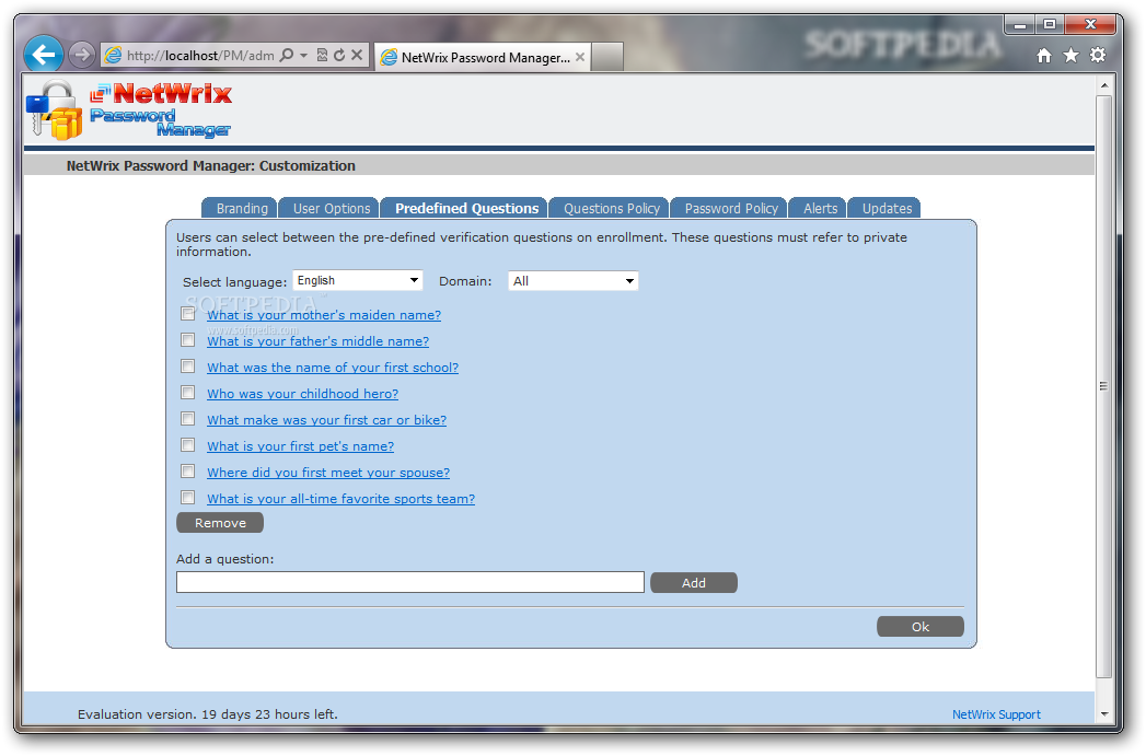 Password Reset Manager uses the question and answer security system for user authentication. First, users enroll by creating their profile. Once the profile is established, the user can manage their password and account manually by simply supplying the answers from profile.