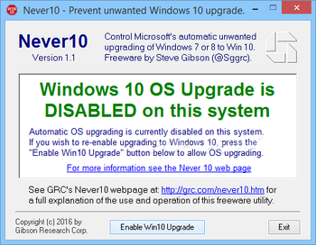 Never10 is designed to block the automatic upgrade to Windows 10 of machines that run on older OS iterations. All it does is configure the local system to prevent instant upgrading. This might not be much to experienced users who can do it themselves, but beginners who are happy with their current version of Windows are surely going to appreciate its simplicity.