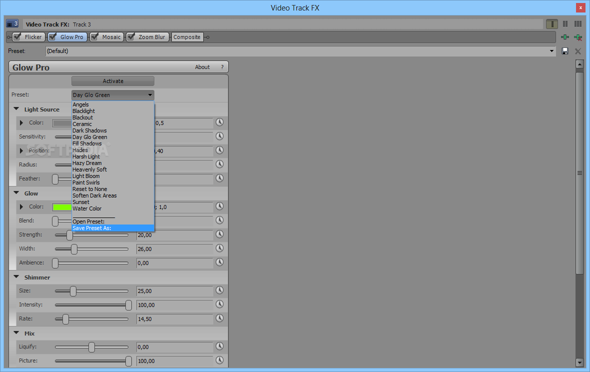 The plugin features four filters for manipulating colors, lights, add creative blurring and mosaic effects to the videos. The Glow Pro filter is designed for adding a surreal glow to the video, in order to soften the image or creating a strong atmosphere. The effects imply a mix of enhancing tools that can augment lights, colors, shimmer and add liquify levels.