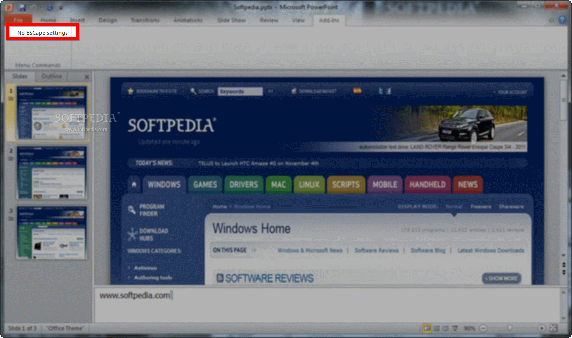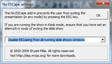 No ESCape is a PowerPoint add-in designed to prevent you from accidentally closing a presentation by hitting the Escape key. The add-in is especially useful for the slideshows that run in kiosk mode and should not be interrupted.