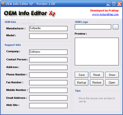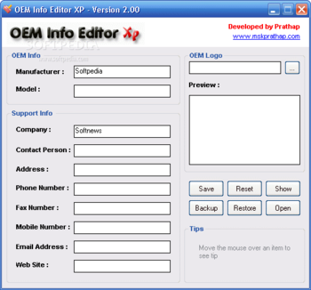 OEM Info Editor XP is a free software by Prathap and works on Windows 10, Windows 8.1, Windows 8, Windows 7, Windows XP, Windows 2000, Windows 2003, Windows 2008, Windows Vista, Windows 2012.