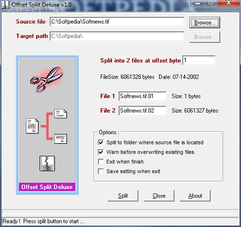 The Offset Spilt Deluxe application was designed to provide a quick way to split file into 2 files at specific offset byte. So, you can send/upload only the 2nd part of files to your friend or strip silent/pop/click byte of mp3 files.