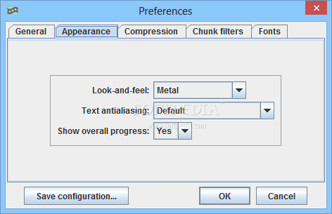 As far as program preferences are concerned, you can pick the charatcer encoding mode, ignore filename cases, display UNIX-style path names, select text when focus is gained, and save the main window location. It is also possible to include or exclude file chunk filters, personalize fonts, and so on. The configuration can be saved to file for future optimization jobs.