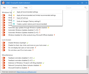 You can download O&O ShutUp10 which is 696.9 KB in size and belongs to the software category System Tweak. O&O ShutUp10 was released on 2017-04-11 and last updated on our database on 2017-04-25 and is currently at version 1.5.