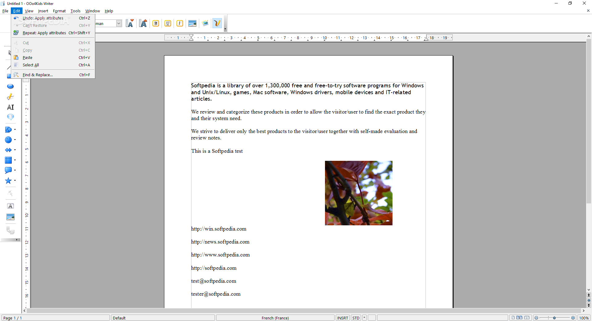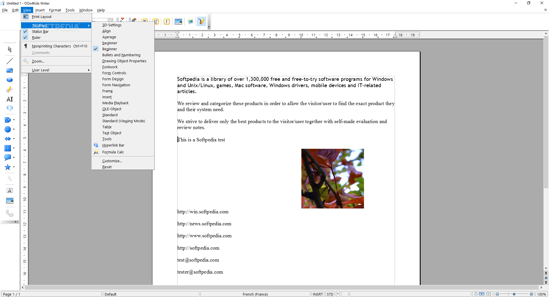 The suite is adapted for children and sports five modules, Writer, Calc, Impress, Draw and Math. It lacks the complexity of the real package and, as such, there is a limited set of functions for each module.
