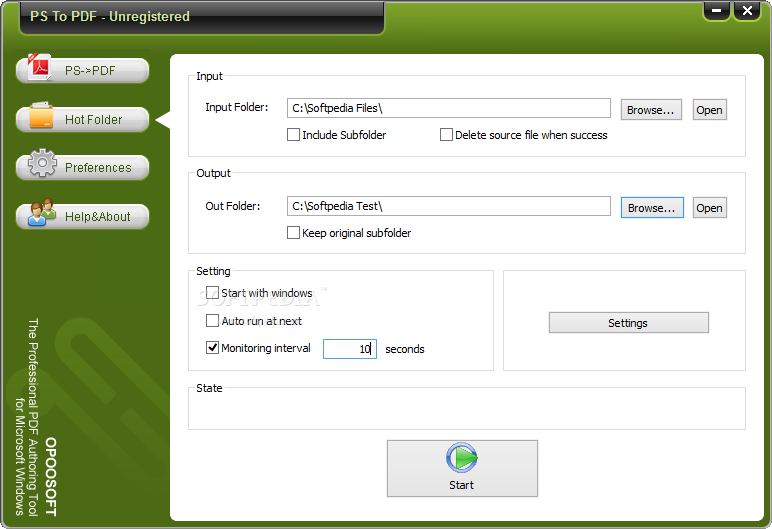 Another interesting aspect of Opoosoft PS To PDF is the 'Hot Folder'. This feature allows you to monitor all incoming files into a user-defined directory and automatically turn all new PS or EPS format files into PDFs, saving them to the previously specified location.