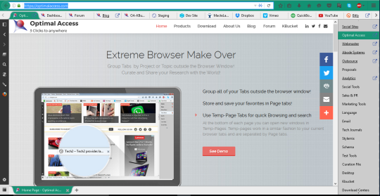 3D Tabbed browser (extension for Firefox) means 3 sets of tabs per window. One set to Group your favorites by interest and/or project (Group Tabs), another set for storing your favorite URLs (Page Tabs) and a third set for temporary browsing (Temp-Page Tabs).Sets of Group tabs are stored in Portal windows. You can switch between portals and archive older projects.Optimal Access comes with a Built in RSS reader and special curation folders for saving articles. To subscribe to feeds you simply drag the RSS link to the Page Tab area and save it. To save an article your simply drag the article to the desired curation folder, the program will scrape the headline, URL, image URL, description, Publisher and Author and let you tag it.