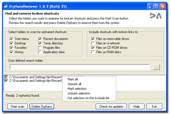 Orphans Remover searches and deletes shortcuts (*.lnk files) with an invalid target in the given folders and subfolders, like your Start menu, Recent documents, etc. These so called orphans are typically the result of uninstalled programs, deleted or moved documents.