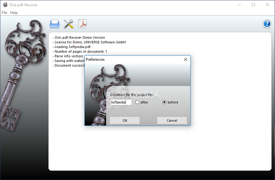 Ovis pdf-Recover is a demo software by UNIVERSE Software GmbH and works on Windows 10, Windows 8.1, Windows 8, Windows 7, Windows XP, Windows 2000, Windows 2003, Windows 2008, Windows Vista, Windows 2012.