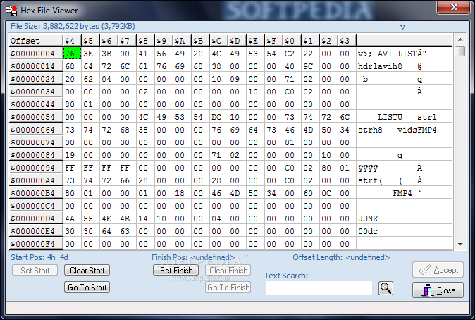 Contains a hex viewer so you can select start and finish positions from the viewer.