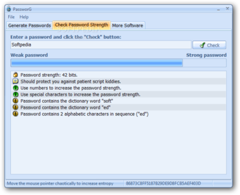 As mentioned, the application also comes with a strength verifier. It can be used for existing passwords, or those you just generated. It shows strength in a progress bar, and also provides suggestions based on word dictionary, level of protection, and strength in bits. All generated items can be saved to a TXT file.