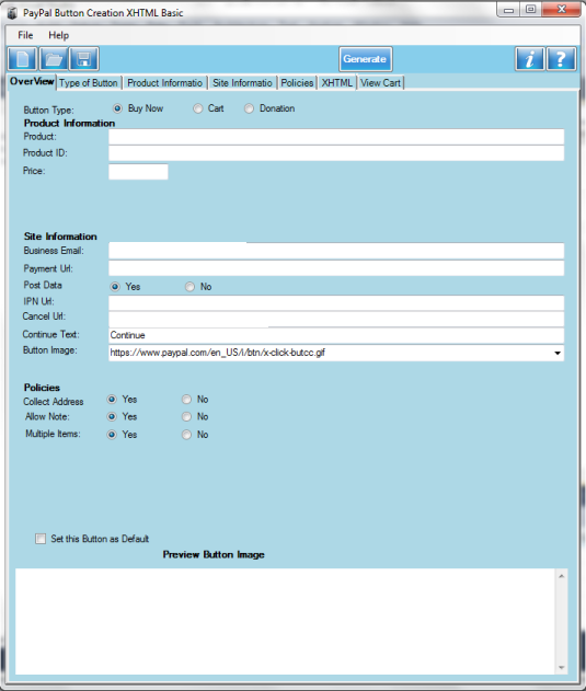What it does:Do you run an online store that uses PayPal to process payments? Then you have come to the right place. We have the PayPal Button Creator in several different editions. With it you can quickly make buttons for your website quickly and easily. And since everything is on your computer you can quickly edit the information you put in and it remains secure and reachable even if your internet goes down.Makes Basic Buttons:PayPal Button Creator Basic HTML Edition allows you to make basic HTML PayPal Buttons. This is for the hobbyist who only wants the bare minimum options for their site. It gives you the ability to set up buttons that include:â?¢the Product Name,â?¢Product ID,â?¢Price.Business Information:With the program, you can setup the information for your site as well. Basic allows you to set: â?¢the ability to add your email â?¢payment urlâ?¢whether or not to post data to your payment urlâ?¢an IPN urlâ?¢a cancel url â?¢what you want on your continue button.Different PoliciesYou can also set up different policies for your website: â?¢whether paypal should collect addresses,â?¢allow a note to you,â?¢if someone can purchase more than one item.Three Types of Buttons:With the basic edition, you can make three types of buttons: Buy Now, Cart, and Donation buttons.Easy to Create Buttons:The PayPal Button Creator Basic HTML program will make regular HTML buttons for you to paste into your websites HTML. It is easy to use and gives you multiple ways to add the information. You can do it quickly on the overview tab or you can use the individual tabs which give more information on what PayPal is looking for.Make View Carts:In addition. you can set up View Carts too for when you use the PayPal Cart system with just your email address and choosing which button to use.
