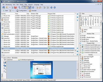 PC Agent monitors and records the activities of all users on a computer unnoticed. The monitoring captures not only the most common activities like keystrokes, visited websites and screenshots, but also Internet activities such as sent and received emails and many more. PC Agent is specially designed to send the records in several different ways.