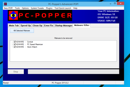 PC-Popper is a computer optimization program that makes your computer run like it should - fast, clean, and error-free. PC-Popper is able to speed up your computers boot time and application startup time, allow you to run more programs simultaneously, fix computer errors, free up hard drive space, perform disk defragmentations, eliminate detected malware and other potentially unwanted programs, and allow you to customize how your computer works. This program stands out among the rest because it was created with you, the user, in mind. It has an easy-to-use interface for beginners, and a customizable interface for more advanced users. PC-Popper is powerful enough to truly optimize your computers performance, yet is less than 1.5 MB in size. Unlike many other programs on the market, PC-Popper will never slow your computer down, nor will it come bundled with any third party software.