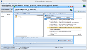 PC Remote Software Deployment allows you to execute remote tasks on network computers. Actions such as package deployment or uninstalling can be automated from the dedicated menu in PC Remote Software Deployment. You simply need to select the executable package from the list, then activate the remote task you wish to perform.