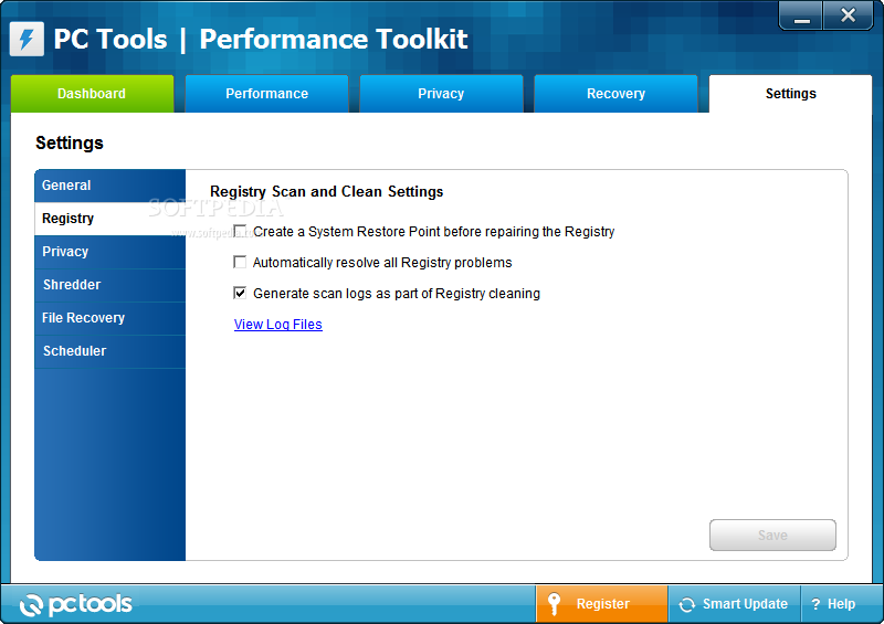 Registry Compacting - For optimized system performance, PC Tools Performance Toolkit’s registry compacting feature analyzes, rebuilds and compresses the Windows registry by removing registry gaps, free space and corrupt keys.