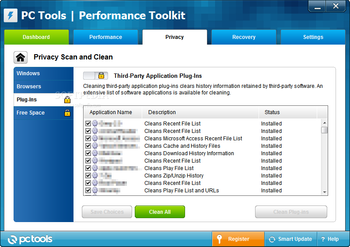 Erase Internet browsing tracks - The Privacy Guardian feature of PC Tools Performance Toolkit cleans all traces of online activity, history and other sensitive data. Specifically, it allows selective cleaning of all traces pertaining to online activities such as cache, cookies, index.dat and history from a variety of web browsers on your PC. This includes other sensitive data such as the Windows Recycle Bin contents, temporary files and the recent file/URL lists of Microsoft Office. It is also capable of cleaning activity tracks from over 50 additional third-party applications, including AOL, ICQ, Windows Media Player and many more.