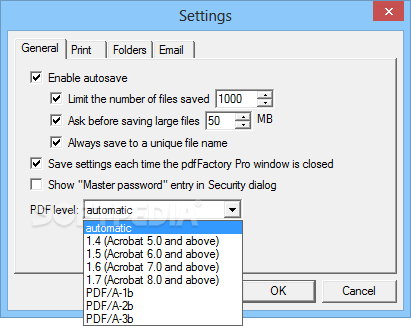 AutoSave: Saves entire contents of pdfFactory sessions automatically so you can retrieve previously compiled PDFs.