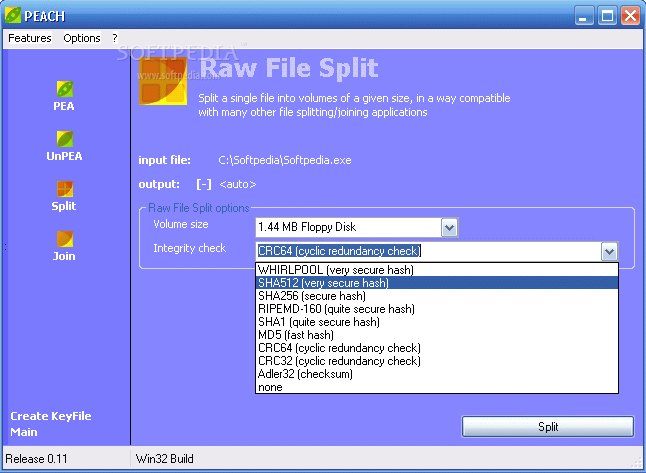 Supports its native .pea archive format (archive/extract) and raw file split/join.