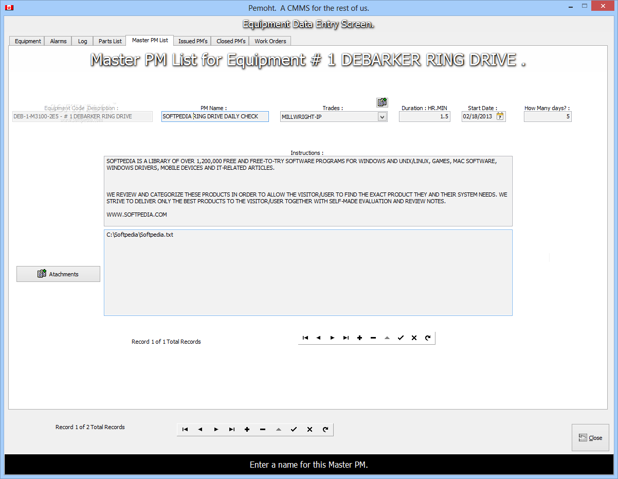 The application allows you to log operational and maintenance procedures, manage assets and keep track of equipment inventory.System requirementsPentium 4