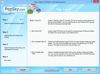 You can burn files or folders onto a blank CD or DVD disc. It supports making bootable discs: