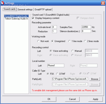 Phone spy telephone recording system will automatically record incoming/outgoing phone calls through your sound card.System requirementsPII