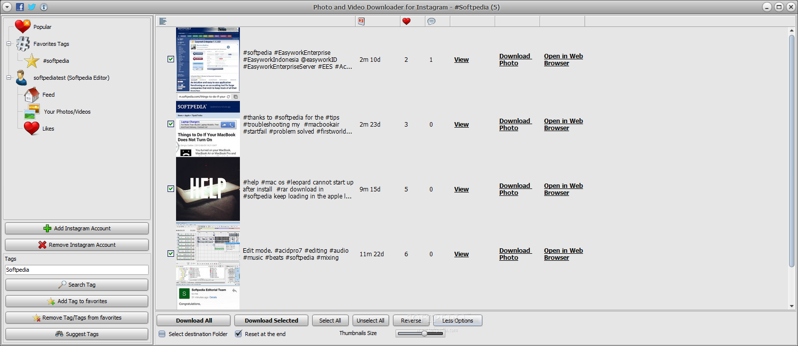 After logging in, you can browse through your own pictures or videos and save the ones you need to your PC. At the same time, you can access your 'Likes' and decide if there is anything you wish to grab from that section. Photo and Video Downloader for Instagram lets you adjust the 'Thumbnail Size' as well as 'Select Destination Folder'.