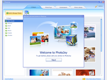 PhotoJoy is an easy-to-use program that transforms personal & professional photos into animated Collages, stunning Screensavers and playful PhotoToys. With PhotoJoy, youll smile more every day as you see your cherished photos brought to life in fantastic new ways. In addition to enjoy your personal photos more, PhotoJoy also provides you with access to hundreds of professional digital photos, so you can transform your computer screen into a work of art.