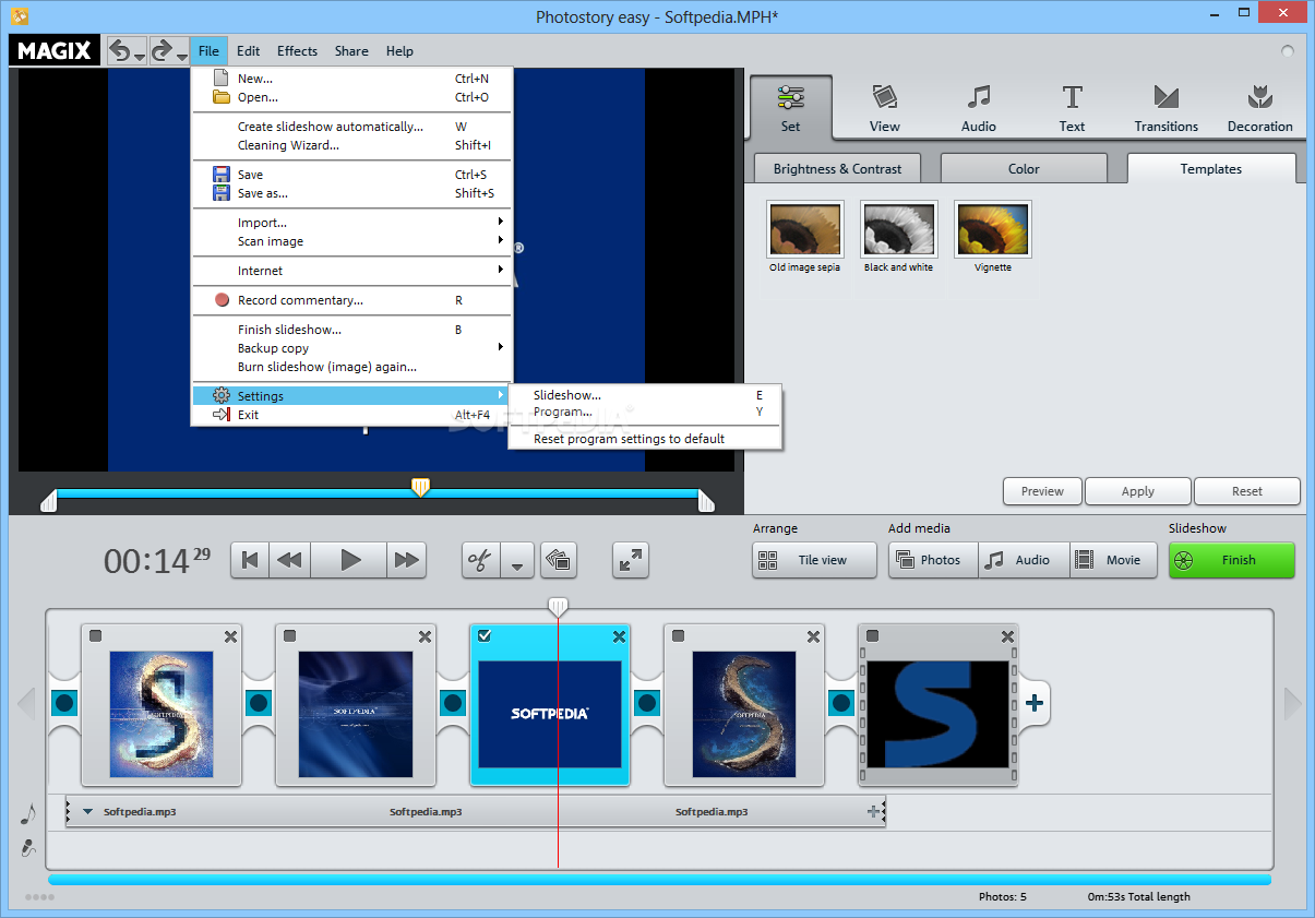 Once you have finished designing your project, it can be exported in multiple forms. You can encode it to MP4 or WMV and save it to your computer, or burn it directly to a DVD, Blu-ray disc or SD card. The program allows you to use templates, in order to add interactive DVD and Blu-ray player menus.