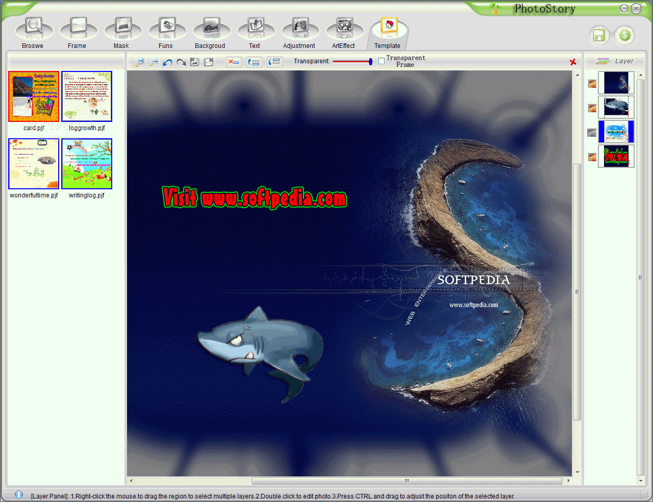PhotoStory puts a rich library with frames, masks, backgrounds and fun objects at your disposal that you can easily add to the picture and preview changes before committing them to file. It's also possible to add text and customize the colors, pattern, shadow effect, font and edges, remove red eye and freckles, draw with a color pen, adjust the brightness level, and perform face lifts on portraits.