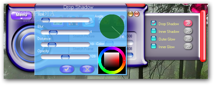 It is possible to add a drop or inner shadow along with an inner or outer glow effect, stretch the picture or the frame, as well as to rotate the image or the frame. The resulted photograph can be set as wallpaper, sent to a friend via email, printed or just exported to file.