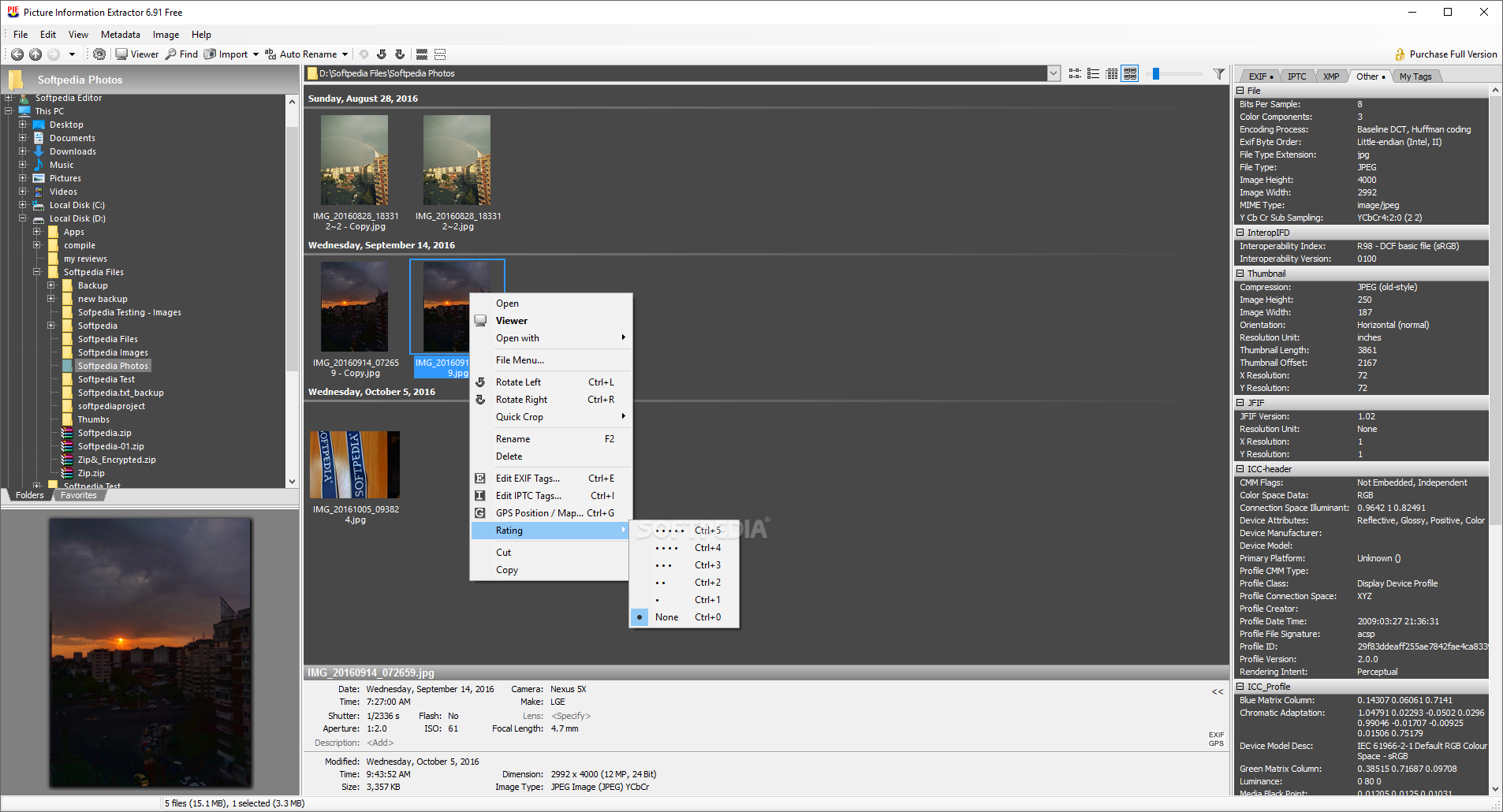 Edit EXIF and IPTC metadata, add or delete tags, change date picture taken, lossless rotate and update embedded thumbnails, in single file and batch mode