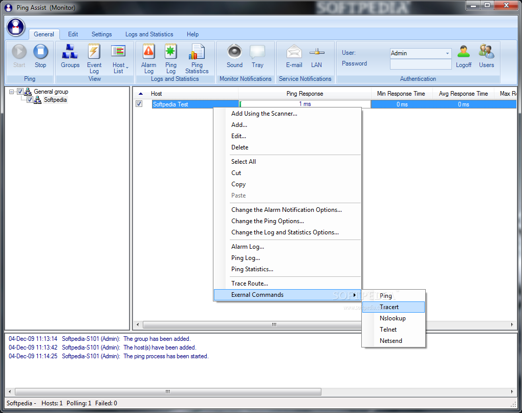 This software tool enables you to create several accounts with password-protection and different permissions, such as enabling individuals to edit the host list, clear logs and stats, and start and stop the ping process.