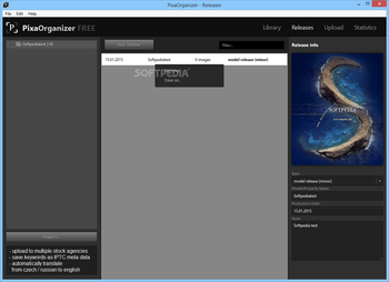 Moreover, you can issue releases by providing some basic information about it, such as the type, model or property name and production date, possibly accompanied by a note. From the ‘Upload’ section of the utility, you can decide which pictures to send to your various stock server accounts, while in the ‘Statistics’ tab, you can get an overview of your earnings over time.