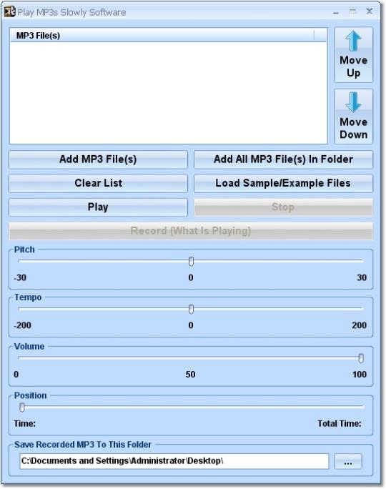 This software offers a solution to users who want to play MP3 files slower or faster, adjust various qualities and save the new versions. The user simply adds the required files or an entire folder before selecting the required: pitch, tempo, volume and the position (time). The selected MP3s can then be played at the new settings and the new version can be saved to a user specified folder.