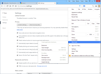 Portable 7 Star Browser allows you to customize the Settings, by specifying a home page, enable/disable automatic kernel switch, the Super Drag option, mouse gestures. You may easily switch between preferred searching engines, enable proxies, manage passwords and adjust privacy settings.