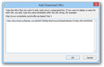 This tool enables you to input an entire list of URLs from which you can start your download tests, as well as from a TXT file or any other format. The main window is going to display all added links, along with details such as name, status, speed (expressed in bytes and bits), size of downloaded item and duration.
