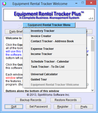 Portable Equipment Rental Tracker Plus is a demo software by SpiritWorks Software Inc. and works on Windows 10, Windows 8.1, Windows 8, Windows 7, Windows 2012.
