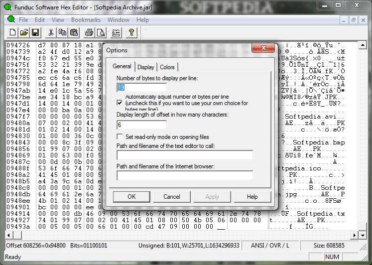 Display Choices (Bytes per line, Offset length, ANSI/OEM, Little-Endian/Big-Endian, Font Size, Screen Colors, & more);