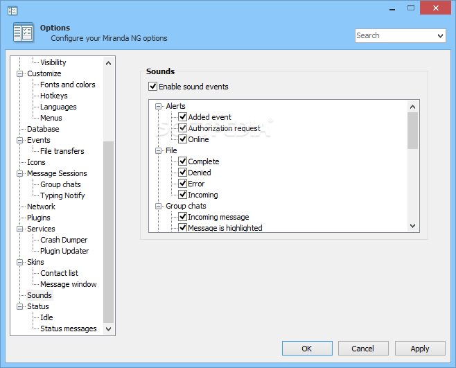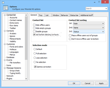 The Total mode allows you to encrypt the entire database, string settings, events and histories, however, it requires more space than the former. The supported extensions can extend the capability of Portable Miranda NG with interface elements, sounds and various protocols. You may thus customize your client to suit your preferences and to optimize its size as well.